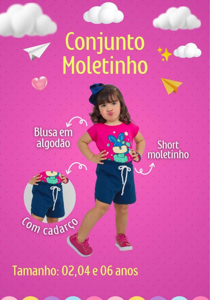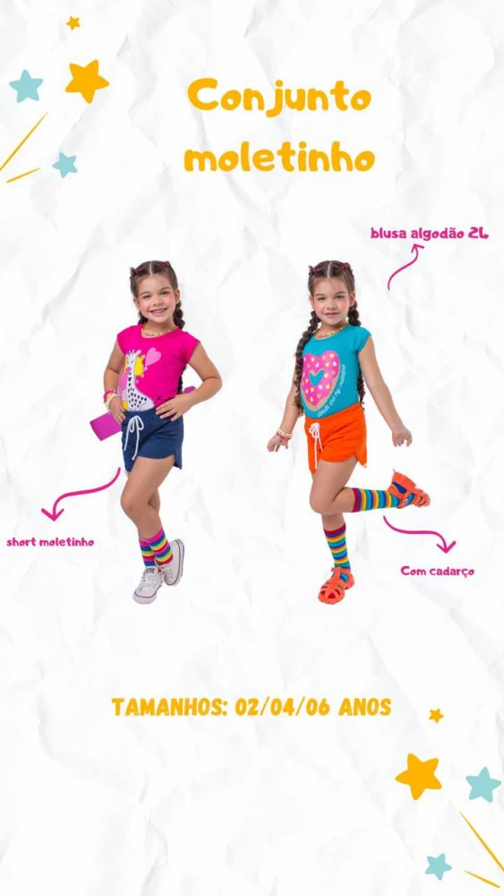 Pacote com 10 peças contém 2 (2 anos), 4 (4 anos) e 4 (6 anos), incluindo várias cores.O conjunto é confeccionado em blusa (algodão 24.1) e short (moletinho) nos tamanhos 2, 4 e 6 anos.Preço unitário: R$ 11,00.